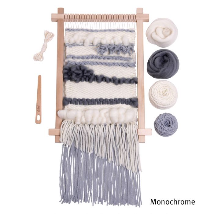 Weaving Starter kit includes: Ashford Weaving Frame, Ashford Weaving Needle, Ashford Tekapo 12ply yarn, Ashford fibre for texture, warp thread, dowel for hanging and instructions.
