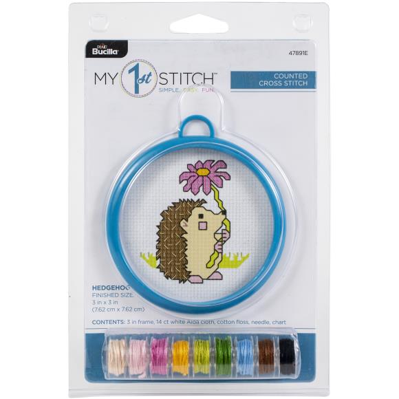 This package contains one 3 inch frame, 14 count white Aida cloth, cotton floss, needle and chart. Finished size: 3×3 inches. Design: Hedgehog. WARNING: Choking Hazard- small parts. Not for children under 3 years. Imported.