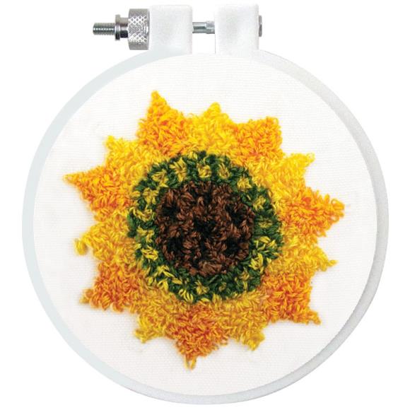 This package contains stamped poly/cotton fabric, 100% cotton embroidery floss, one 3.5 inch hoop and fully illustrated instructions. Finished Size 3.5 inch round. Punch needle sold separately. Made in the USA.