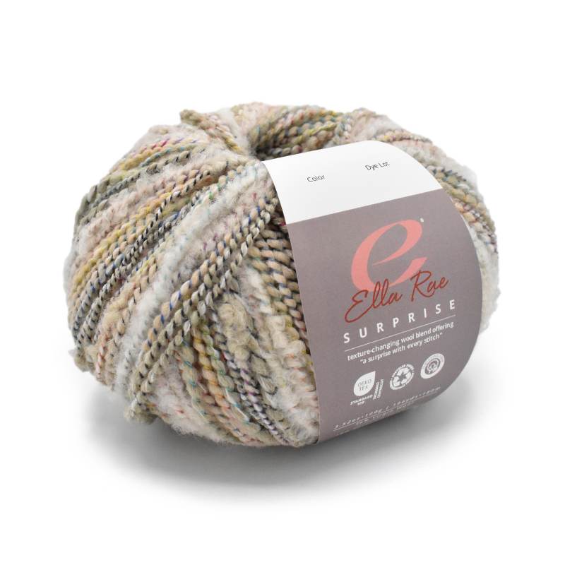 Just when you think you know what’s coming, Surprise shifts gears – in color and in texture. This playful medium-weight yarn from Ella Rae blends 36% virgin wool, 50% acrylic, and 14% recycled polyester into a dynamic knitting experience… One that’s full of delightful twists and turns. Made in Italy and available in 10 vibrant, self-striping colorways, each 100-gram skein of Surprise offers 196 yards of machine-washable ease. But what truly sets it apart is its unique texture-changing quality – transitioning between smooth and slubby, matte and lustrous, to create a fabric that’s as visually engaging as it is touchable. Whether you’re stitching up cozy accessories, statement garments, or just in it for the adventure, Surprise makes every project feel like a creative discovery.