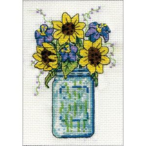 Kit contains: White Aida cloth, six-strand cotton floss, needle, self-adhesive mounting board, White plastic frame approximately 2-1/2in (shape varies), chart, and instructions. Made in USA.