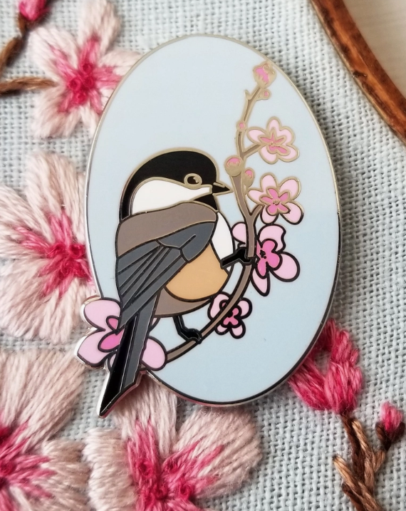 This package contains 1 needle minder. This sweet magnetic pin is 1.25 inches tall and is made of hard enamel with pretty raised silver colored plating. The back has a removable magnet for you to sandwich your needlework fabric.