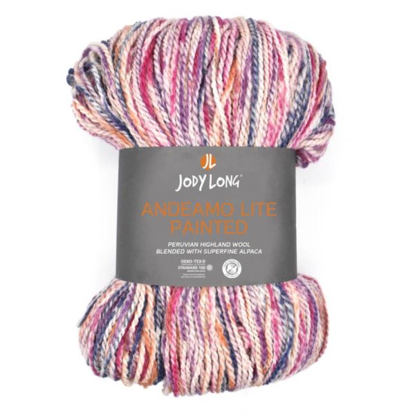 Made in Peru, this worsted wool/alpaca blend is the little brother of the popular Andeamo: lightly spun two-ply is a dream to knit with and it will fly off your needles. It is available in bright saturated colors to complement Jody Long’s own gifted pattern support.