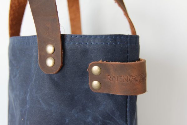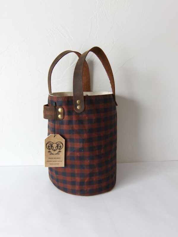 Bison hide handles paired with gorgeous waxed canvas exterior and organic cotton canvas interior make this project bag unique. This material is a dry waxed canvas, which does not feel waxed, but is still water resistant. It is a fine tight weave, 7.2 oz lighter material from Merchant & Mills in the UK. Bison leather handles are rustic leather from the Montana Leather Company, no edge treatment is applied after cut from the hide. The leather will break in with the natural oils of your hands. Exterior dry waxed canvas is water resistant and wipeable, spot clean only.