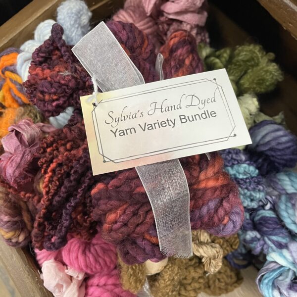 A mix of hand-dyed, textured yarns including Wool/Alpaca Boucle, Sari Silk, Silk Ribbon, and Wool Yarns