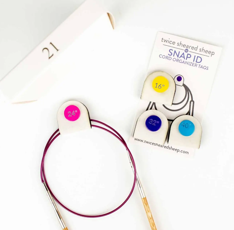Is your needle bin a mess of tangled cables? Do you have to compare every cord every time and say “I THINK this one is a 16″…”? We’d like to introduce our new Snap ID cord organizer tags!