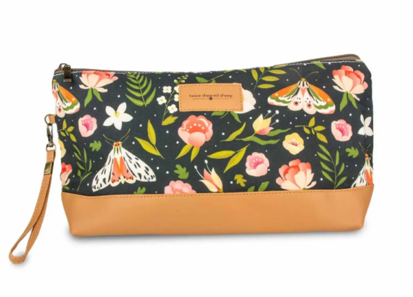 The wipe-clean vegan leather bottom ensures that it stays clean no matter where you set it, and the exterior zippered accessories pouch keeps all your notions.
